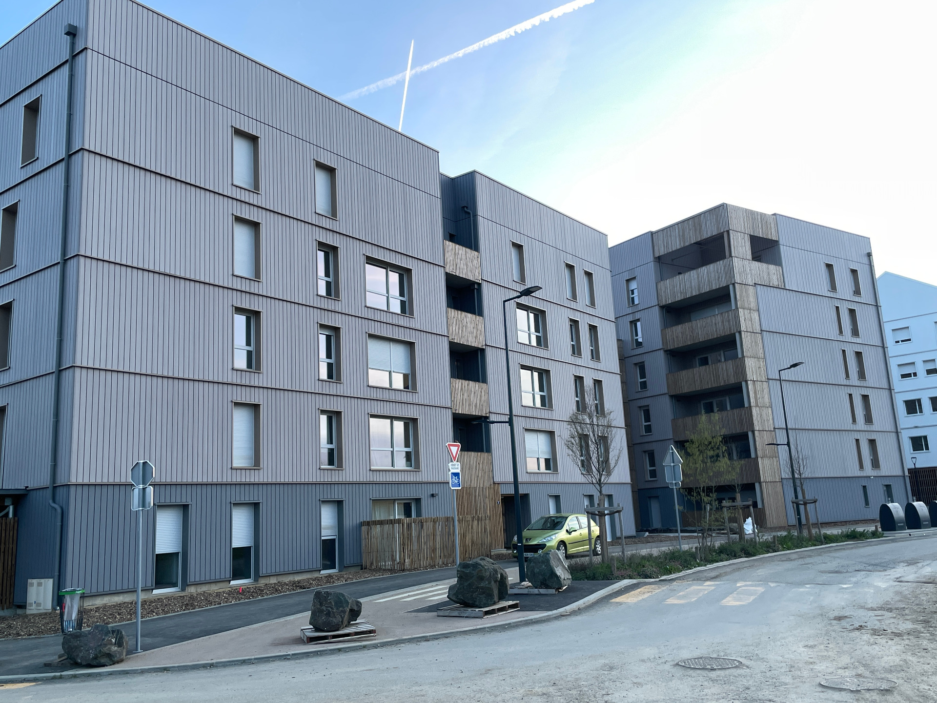 S'engager dans la transition énergétique impose aux constructions « bas carbone » une orientation vers une simplification des volumes. Aussi, les 4 bâtiments sont pensés comme des monolithes dont les évidements constituent les espaces extérieurs des logements. Au RDC, les volumes des abris vélos émergent de manière aléatoire avec leur toiture zinc bipente.